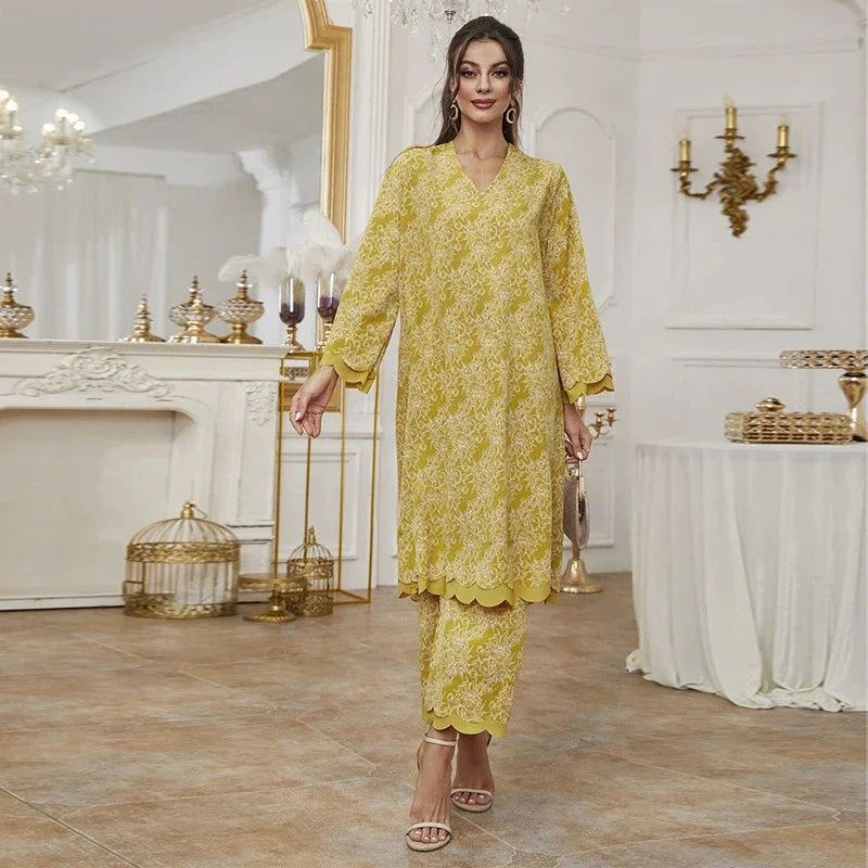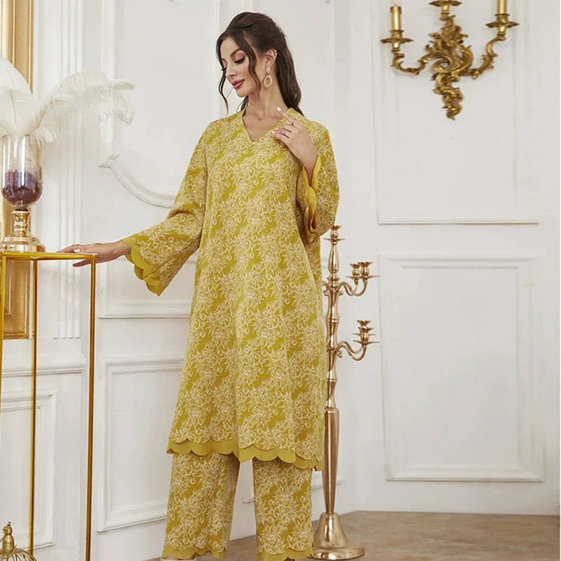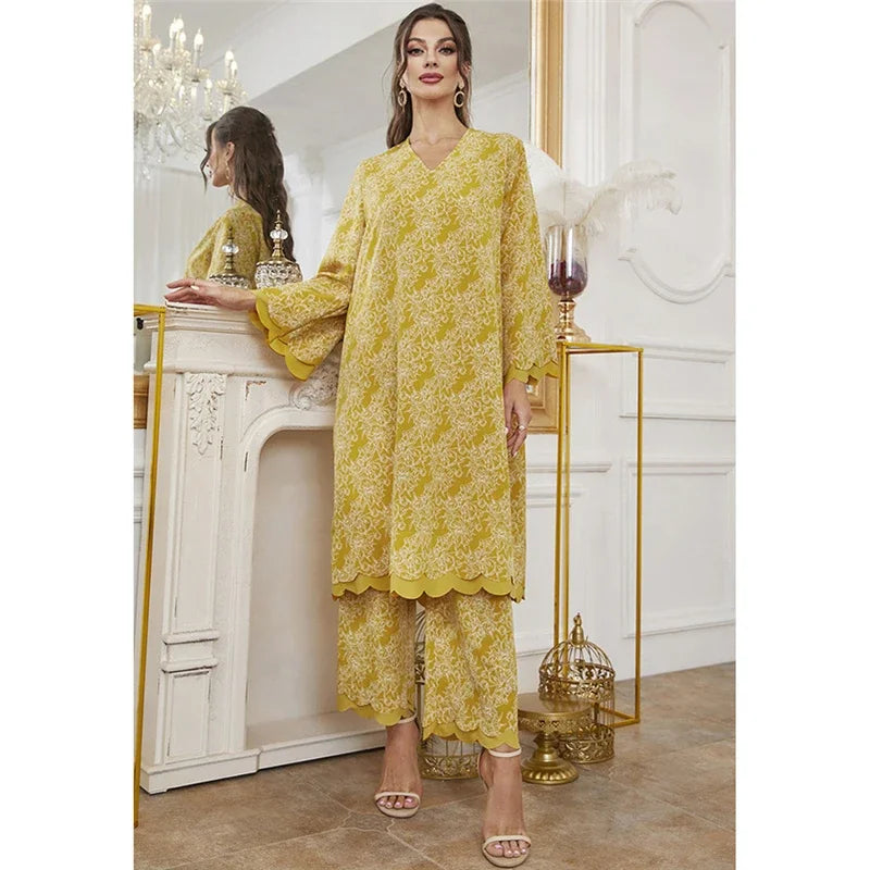 2 Piece Abaya Muslim Set Ramadan for Women Dubai Turkey Saudi Casual V-Neck Print Long Sleeve Dress Pants Islamic Clothing Suits